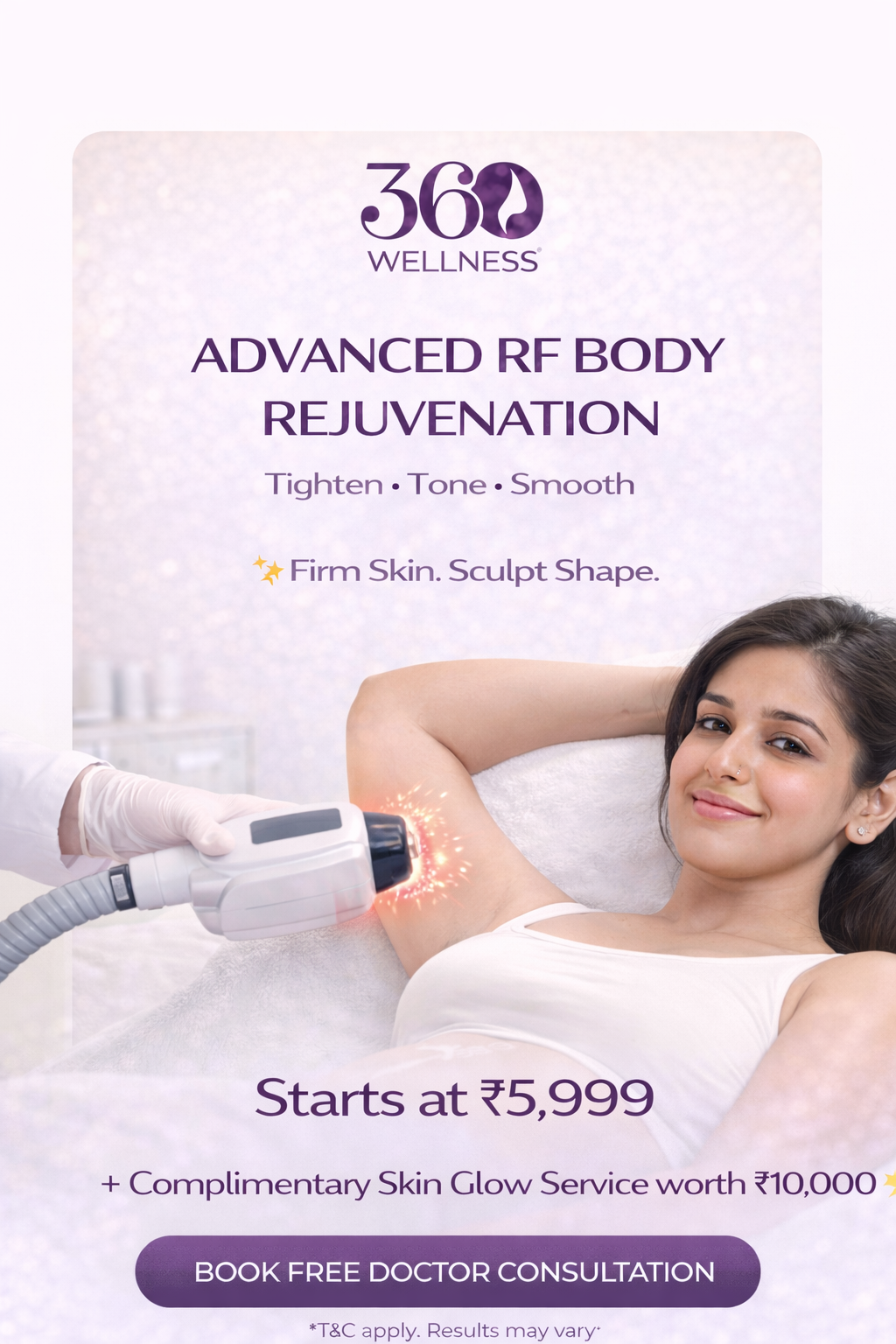 RF Skin Tightening is a non-surgical, science-backed treatment that uses safe radiofrequency energy to heat deep skin layers, stimulating your body's natural collagen production. This results in firmer, younger-looking skin on face, neck, arms, and body - without injections or downtime.