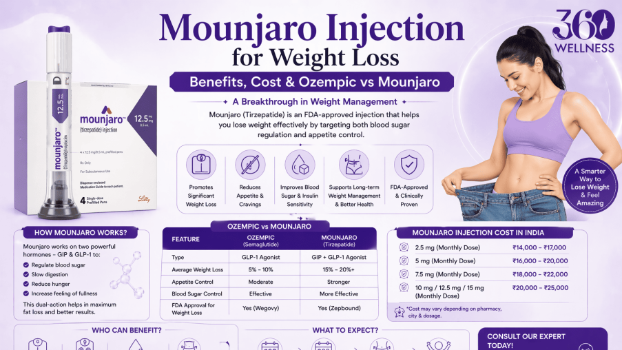 Weight loss treatments have evolved rapidly, and medications like Mounjaro are gaining massive popularity for their effectiveness. Originally developed for managing Type 2 Diabetes, Mounjaro is now widely used for weight loss and metabolic health improvement. At Wellness 360 Clinic, a leading dermatologist clinic in Delhi NCR, expert doctors guide patients with safe and personalized weight management solutions. Mounjaro is an injectable medication that works by mimicking natural hormones (GLP-1 and GIP) to: Reduce appetite Slow down digestion Improve blood sugar control Support significant weight loss It is administered once weekly under medical supervision. Clinical studies show that Mounjaro can help patients lose 10%–20% of body weight when combined with proper diet and lifestyle changes. Strong appetite suppression Better fat loss compared to many alternatives Improved insulin sensitivity Long-term weight management This makes it one of the most advanced non-surgical weight loss options available today. Both medications are popular, but they work slightly differently. Contains semaglutide Works on GLP-1 receptor only Effective for diabetes + moderate weight loss Contains tirzepatide Works on GLP-1 + GIP receptors (dual action) Higher weight loss potential Conclusion: Mounjaro may provide better weight loss results, but the choice depends on individual health conditions. The cost of Mounjaro varies depending on dosage and availability. ₹8,000 – ₹15,000 per injection (approx.) Monthly cost depends on dosage and treatment plan. At Wellness 360 Clinic, patients receive complete guidance, dosage planning, and monitoring for safe results. You may benefit from Mounjaro if you: Are overweight or obese Struggle with weight loss through diet alone Have insulin resistance or Type 2 Diabetes Want a non-surgical fat loss solution Like any medication, Mounjaro may have mild side effects: Nausea Vomiting Loss of appetite Digestive discomfort Always use under medical supervision. Expert medical guidance Personalized weight loss plans Safe & monitored treatment Advanced non-surgical fat loss solutions One of the trusted clinics in Delhi NCR for weight management treatments. If you are looking for an effective and modern solution for weight loss, Mounjaro offers promising results. However, choosing between Ozempic and Mounjaro should always be based on expert consultation. For safe and effective treatment, consult Wellness 360 Clinic for personalized guidance.What is Mounjaro Injection?