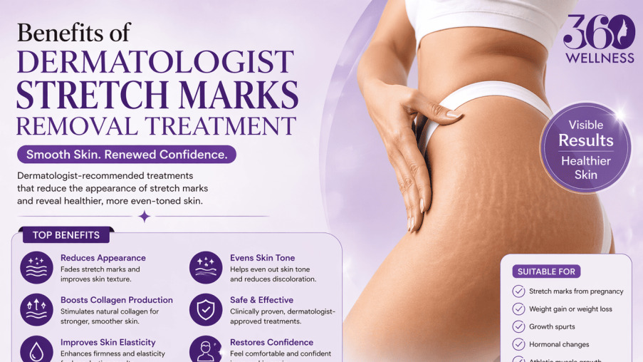 At Wellness 360 Clinic, known as one of the best skin clinics in Delhi NCR, advanced technologies are used to safely treat stretch marks and restore smoother, even-toned skin. Stretch marks (striae) appear as streaks or lines on the skin when it stretches rapidly. They often occur on: Abdomen Thighs Arms Hips Breasts They may start as red or purple marks and gradually fade into white or silver lines over time. Understanding the causes helps in choosing the right stretch marks removal treatment in Delhi: Rapid weight gain or weight loss Pregnancy stretch marks Hormonal changes Muscle building (gym stretch marks) Genetic factors Skin elasticity loss Modern treatments can effectively improve skin texture and reduce marks. At Wellness 360 Clinic, popular options include: Laser therapy stimulates collagen production and reduces the visibility of stretch marks. Tiny needles create micro-injuries to boost collagen and skin repair. Uses your own blood platelets to rejuvenate skin and improve healing. Helps in exfoliating damaged skin and promoting new skin growth. Tightens skin and improves elasticity. The stretch marks removal treatment cost in Delhi depends on several factors such as treatment type, severity, and number of sessions required. Laser treatment: ₹3,000 – ₹10,000 per session Microneedling: ₹2,500 – ₹8,000 per session PRP therapy: ₹5,000 – ₹15,000 per session Chemical peel: ₹2,000 – ₹6,000 per session At Wellness 360 Clinic, you get customized packages, ensuring effective results at competitive pricing. Stretch marks removal is not a one-time procedure. Typically: Mild stretch marks: 3–5 sessions Moderate to severe: 6–10 sessions Results improve gradually with each session. Improves skin texture and tone Boosts collagen production Reduces visibility of marks Safe and non-invasive options available Long-lasting results At Wellness 360 Clinic, treatments are designed to deliver natural-looking improvements with minimal downtime. Choosing the right clinic is crucial for effective results. Wellness 360 Clinic stands out as a leading dermatologist clinic in Delhi NCR because of: Experienced dermatologists Advanced laser and skin technologies Personalized treatment plans Affordable stretch marks removal treatment cost in Delhi High patient satisfaction You are a good candidate if you: Have visible stretch marks (new or old) Want smoother, clearer skin Prefer non-surgical skin treatments Are in good general health If you're struggling with stubborn stretch marks, professional stretch marks removal in Delhi can make a significant difference. With advanced treatments like laser therapy, PRP, and microneedling, smoother and healthier skin is achievable. For the best results, trust Wellness 360 Clinic, a top-rated skin clinic in Delhi NCR offering safe, effective, and affordable solutions.What Are Stretch Marks?
